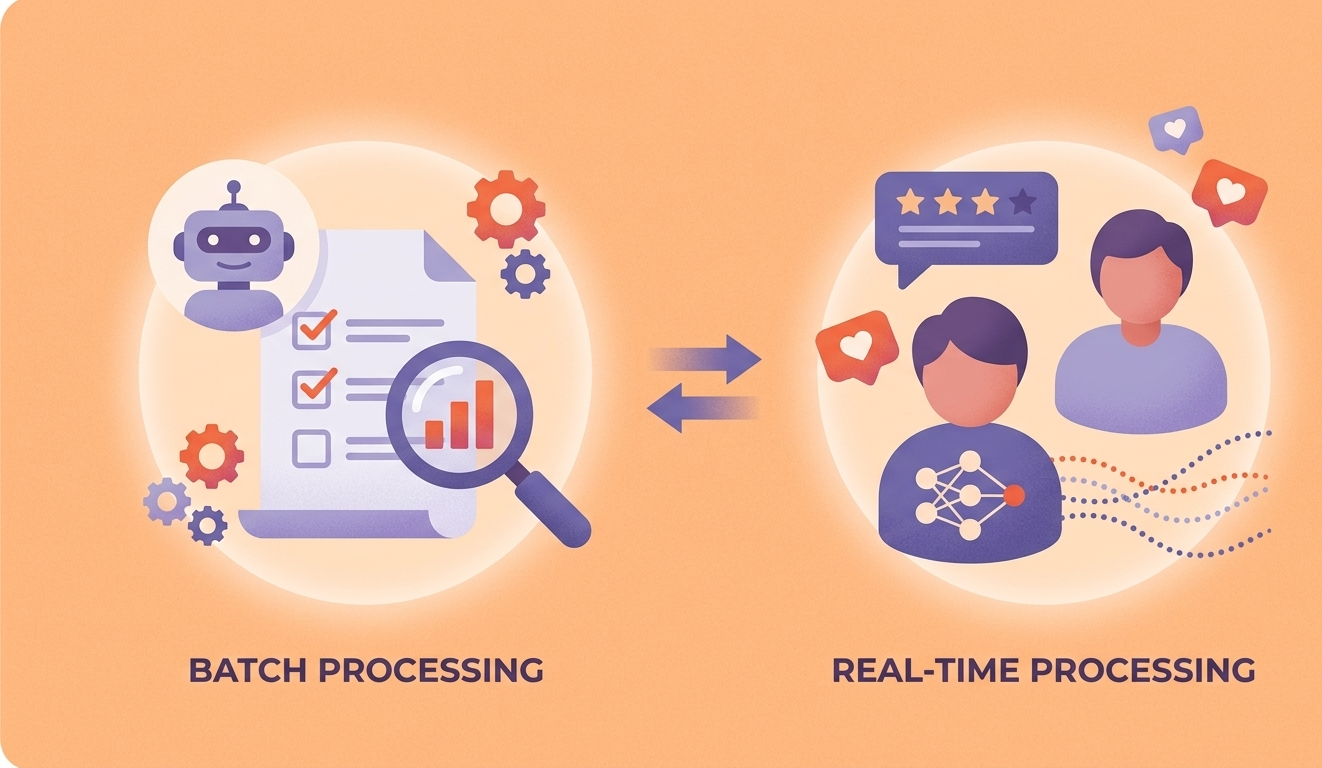 Machine learning systems process data in two fundamental modes: batch (offline, scheduled) and real-time (online, on-demand). Batch processing runs predictions on large datasets at scheduled intervals — ideal for analytics, recommendations, and reporting. Real-time processing generates predictions on individual data points as they arrive — essential for fraud detection, personalization, and interactive applications. Many production systems use both, and choosing the right mix is a critical architectural decision.